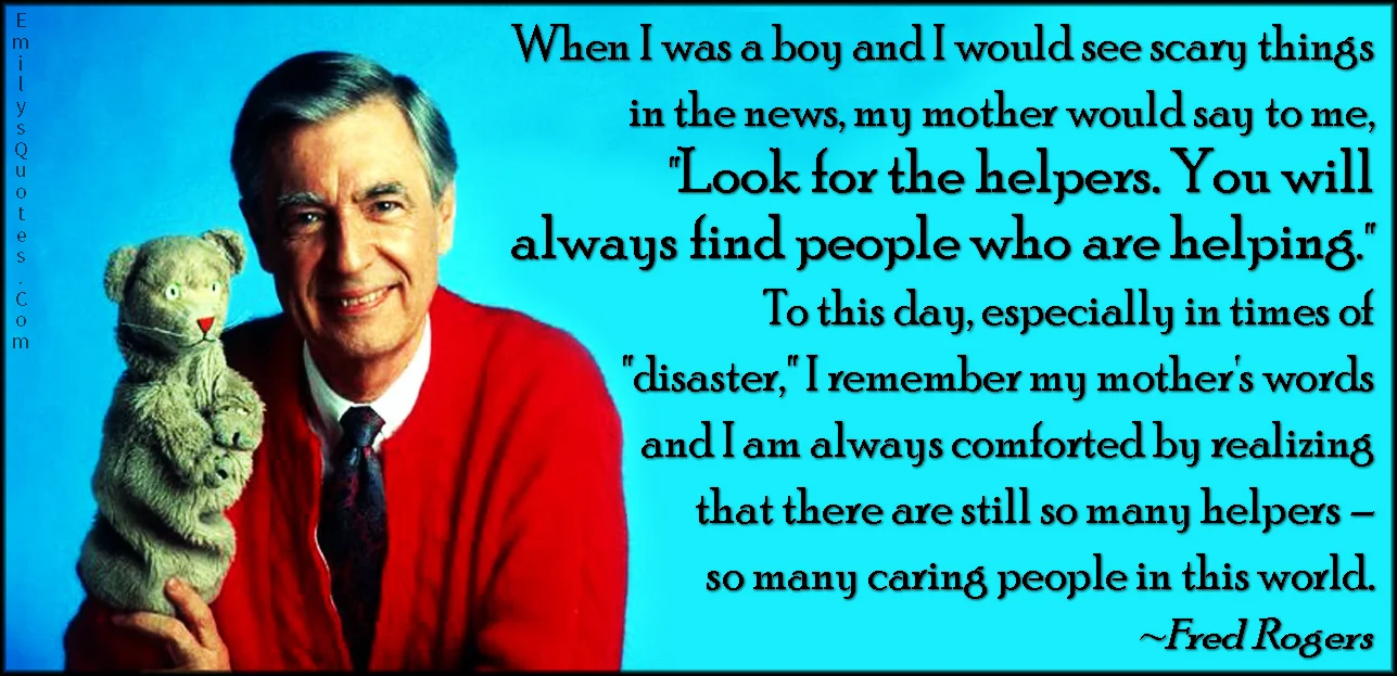 One of my favorite quotes is from Mr. Rogers. This is what we need to focus on. Stop dwelling on what is wrong in the world, our life, with us, etc. and start looking at what is GOOD. Start looking for the helpers. Ten years ago, I wouldn't be able to see that. Now, I can't imagine looking for anything else. Why?